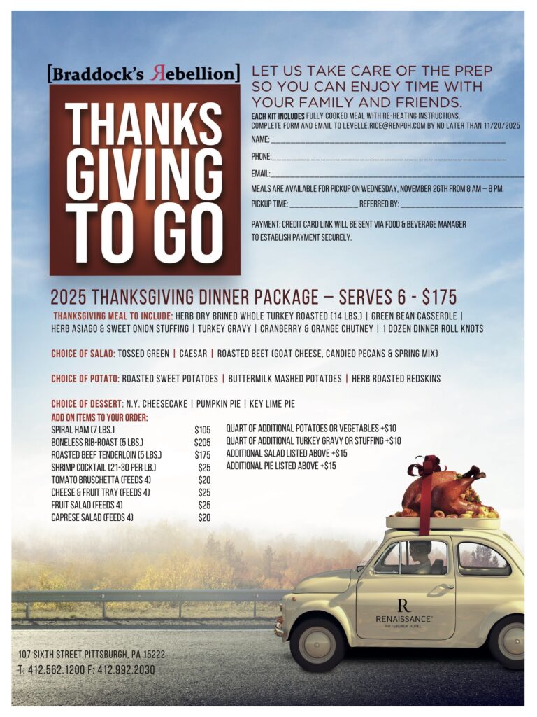 Renaissance Pittsburgh Hotel/Braddock’s Rebellion proudly offering Holiday Dinners. Leave the cooking to us so you can enjoy time with your family and friends. Fully cooked meal, provided with re-heating instructions. All you need to do is warm them up. Complete the to-go order form by 11/20/2025. If filling out the form online, we will contact you to confirm your order and request payment, at which point you can also request ADD ON ITEMS.